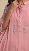 A Baby Pink Indo Western Dress combining traditional and modern elements to make a fashionable statement at events with cape style kurta and palazzo pants. The set is designed with sequins and beads embroidery. The merging of styles creates an artistic look perfect for special celebrations.