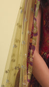 An elegant Tyrian Purple Longdress embellished with intricate zardozi and bandhani pattern for festive occasions. The sleeveless long top pairs well with the subtly decorated sheer dupatta for a graceful festive look.
