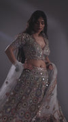 Beautiful Natural Beige Lehenga Set with colorful embroidery on the lehenga and blouse. The lehenga features vibrant circular patterns in hand work of sequins, mirror work. Accentuating the set with an ornate dupatta. Perfect for weddings and festive wear.
