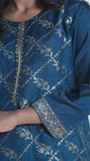 Sharp Prussian Blue Straight Suit Set perfect for casual meetings and events. The colour adds richness while the floral zari weaving all over elevates the look. The ornate kurta and dupatta is balanced with solid pants
