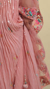 A gorgeous Tulip Pink Lehenga Set perfect for your big day. The sleeveless choli is decked with floral and thread work embellishments, accentuating beautifully with the embroidered lehenga. Complete the look with a minimally designed but beautifully sheer dupatta around the edges.